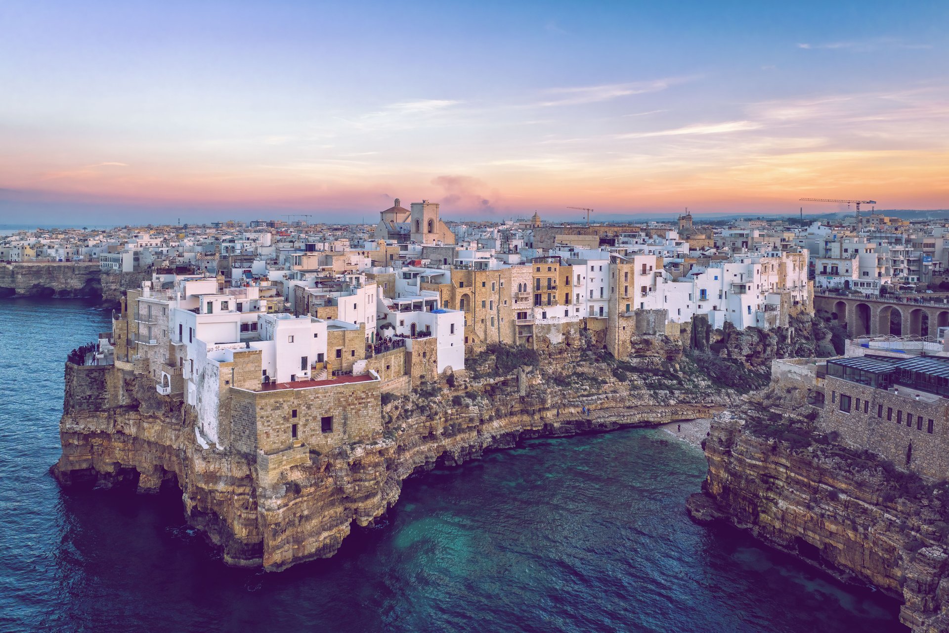 Polignano a Mare, nur eine kurze Zugfahrt von Bari entfernt, ist eine kleine Küstenstadt, die spektakulär auf Kalksteinklippen über der Adria thront. Berühmt für ihre türkisfarbenen Buchten, verwinkelten Gassen und das historische Zentrum, lädt die Stadt auch außerhalb der sehr geschäftigen Hochsaison zu entspannten Spaziergängen entlang der Küste und zu kulturellen Erlebnissen ein.